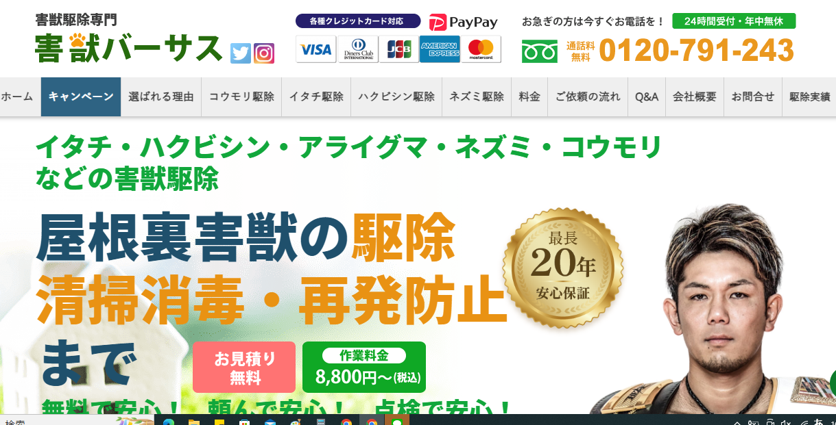 また年中無休で営業しており、関東圏では年間10,000件以上の施工実績を積んでいます。安心して相談、依頼ができる駆除業者です。