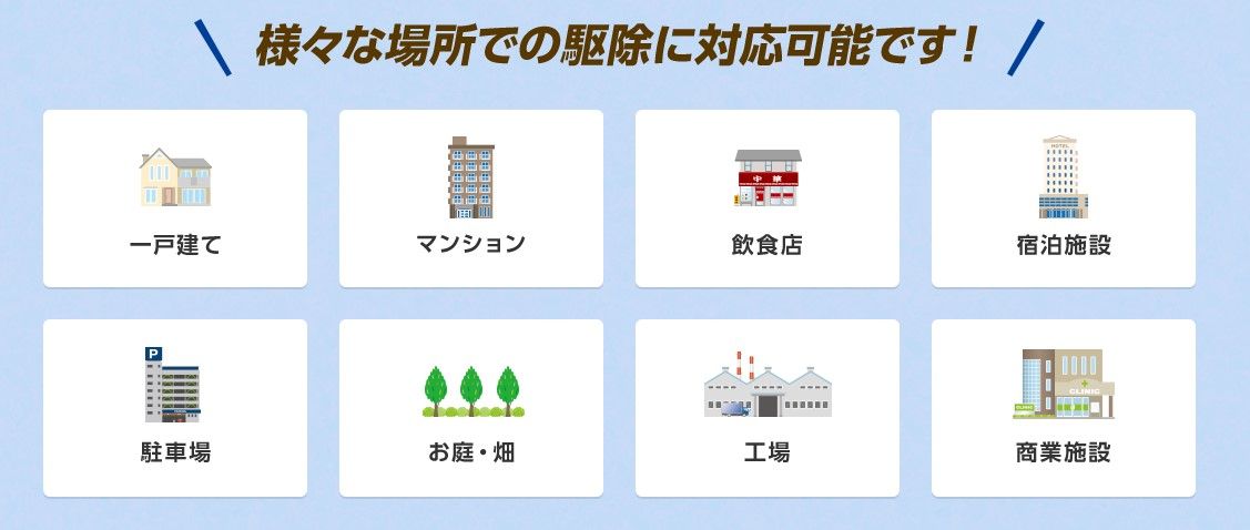 害虫の生活救急車は、他社と比較しても多種多様な施設の害虫駆除に対応しています。