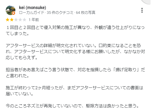 悪い口コミはいくつかありましたが、金額やスタッフ対応についての口コミが多く、技術面での悪い口コミはあまりありませんでした。
