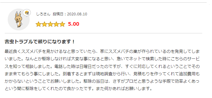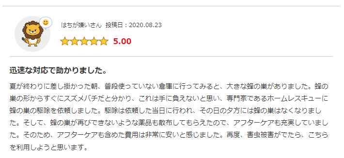 ホームレスキューは、現地到着まで最短30分と謳っているように、素早い対応が徹底されています。コールセンターのスタッフも専門教育が徹底されているので、現場スタッフへの引継ぎがとてもスムーズなことに加え、地域密着型の駆除業者なので現場へ急行することが可能なのです。