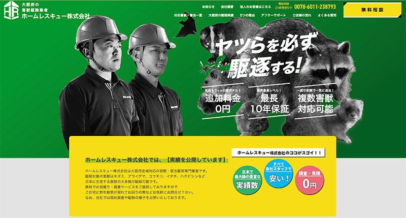ホームレスキューは、害獣駆除部門と建築部門がある「家の専門家」です。専門家だからこその豊富な知識と、高い技術力、多くの実績が自慢の会社です。