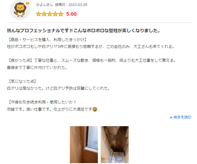 「大工仕事もしてもらえる」のは、建築部門もあるホームレスキューならではの高評価ですね。