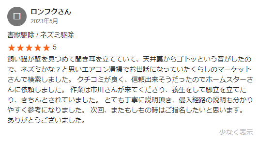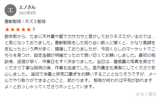くらしのマーケットを見ると、ネズミ駆除に関するいい口コミがたくさんあります。丁寧な対応が信頼できると評判でした。