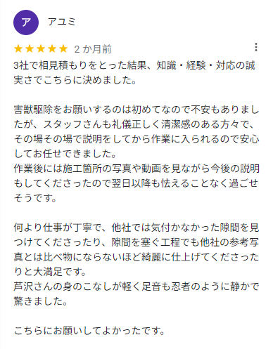 営業担当も現場担当も説明が丁寧で好印象だったようです。他社では気付かなかった箇所を見つけるなど、高評価なのも納得です。