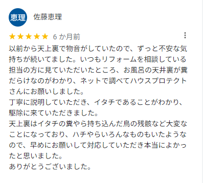 ハウスプロテクトは母体がリフォーム会社ならではの技術で、侵入経路を塞ぐような再発防止施工が可能です。駆除後すぐに再発することも多いので、ハウスプロテクトならその点安心して生活できるのではないでしょうか。