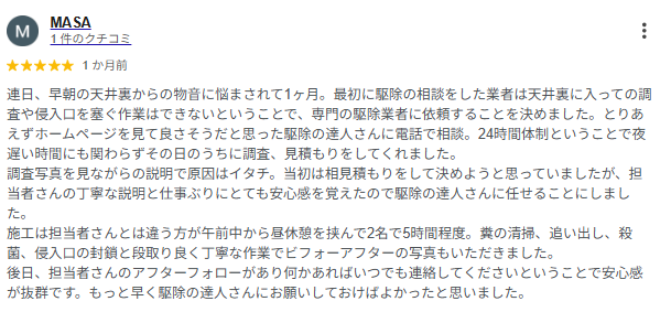 接客対応がていねいで、駆除の達人の社員教育レベルが高いと感じた方のレビューです。心配事をひとつひとつ聞く姿勢と真摯な対応で解決できたと言います。