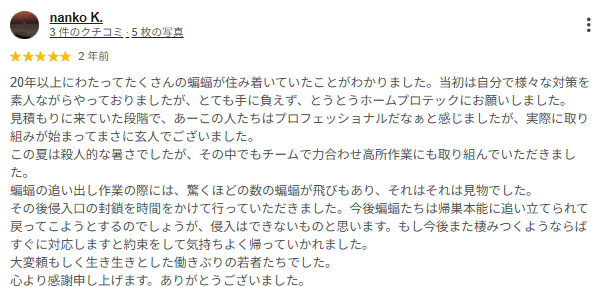 作業日程がかかったり抜けがあったりといった点に疑問を感じた方の口コミです。ただし、最終的には薬剤の散布と侵入口を塞ぐ作業を行ったことには満足しているようでした。