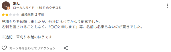 見積もりを依頼したのに他社と比べて割高だったという意見が見られました。名刺も渡されなかったとのことで社員教育の課題を感じます。