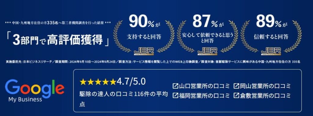 日本ビジネスリサーチのインターネット調査の結果、駆除の達人は「支持する(90%)」「信頼する(89%)」「安心できる(87%)」の3部門で高評価を獲得しました。