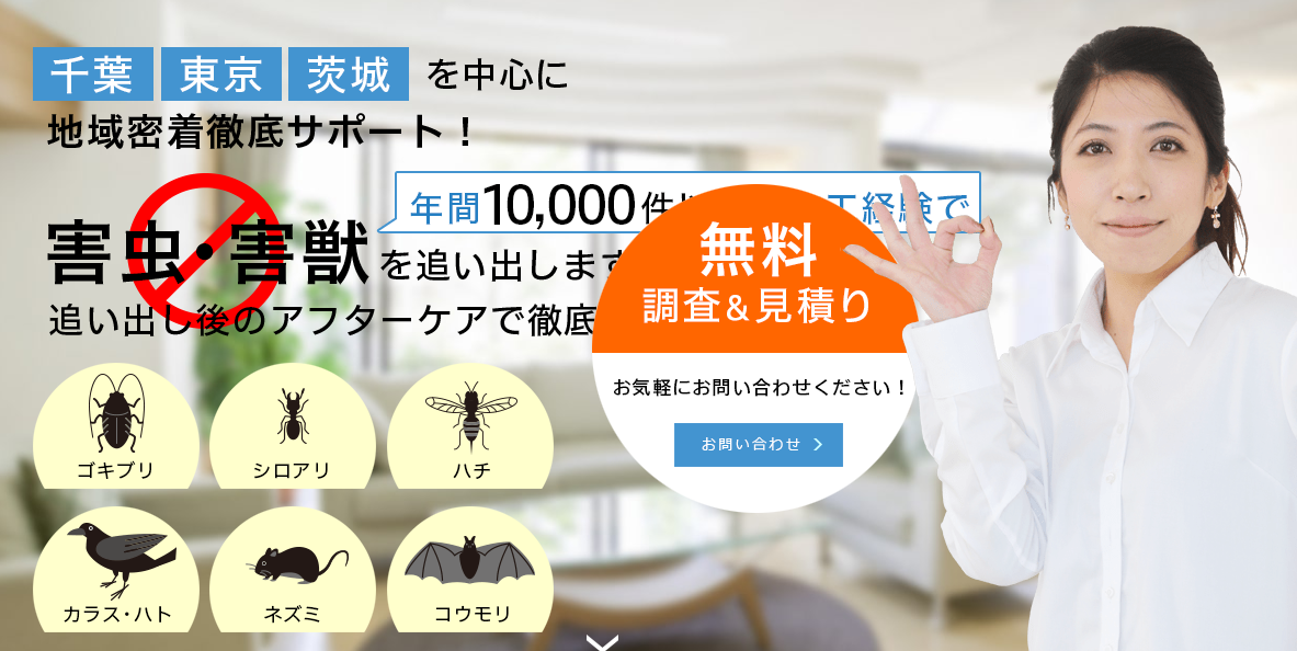 また年中無休で営業しており、関東圏では年間10,000件以上の施工実績を積んでいます。安心して相談、依頼ができる駆除業者です。