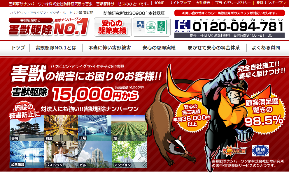 害虫駆除ナンバーワンは、株式会社防除研究所が運営する害虫・害獣駆除業者です。徹底した調査で問題点を洗い出し、完全に駆除できる施工見積りを顧客に提出しています。