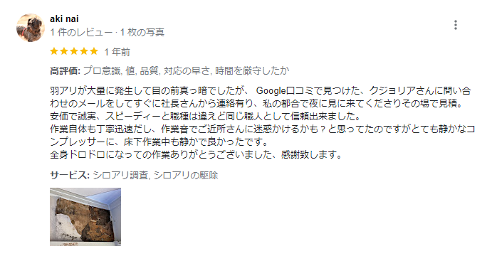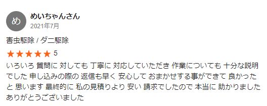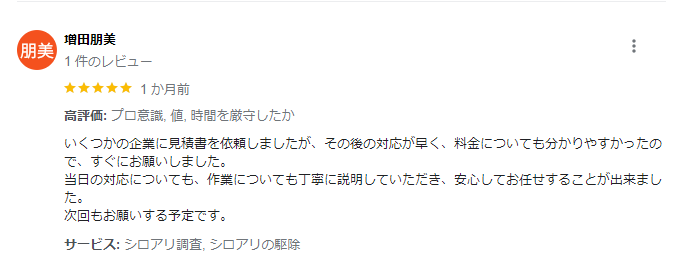 口コミをいくつか調べたところ、「料金が安い」「料金の説明が丁寧」という口コミが多く見られました。安いことはもちろん嬉しいですが、料金の内訳が正当なもので説明に納得がいくというのは、安心材料のひとつです。