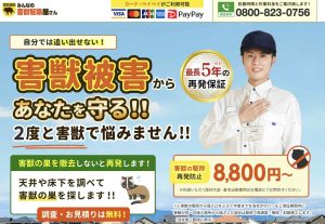 害獣に詳しいプロが多数在籍しており、自治体の条例に沿った駆除を遵守してくれます。再発防止にも徹底した対応で、万が一の場合でも最長5年保証が付いて安心です。