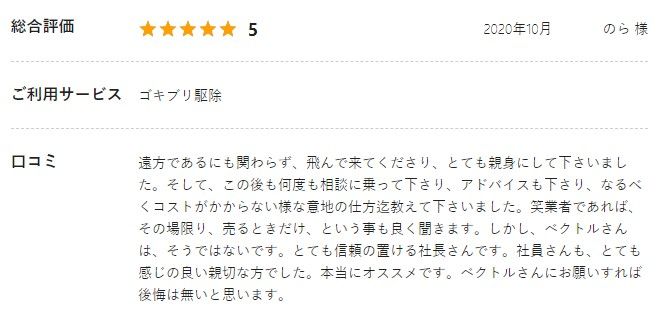 株式会社ベクトルでは、人柄の良さと、徹底的な駆除が評価されているようです。
